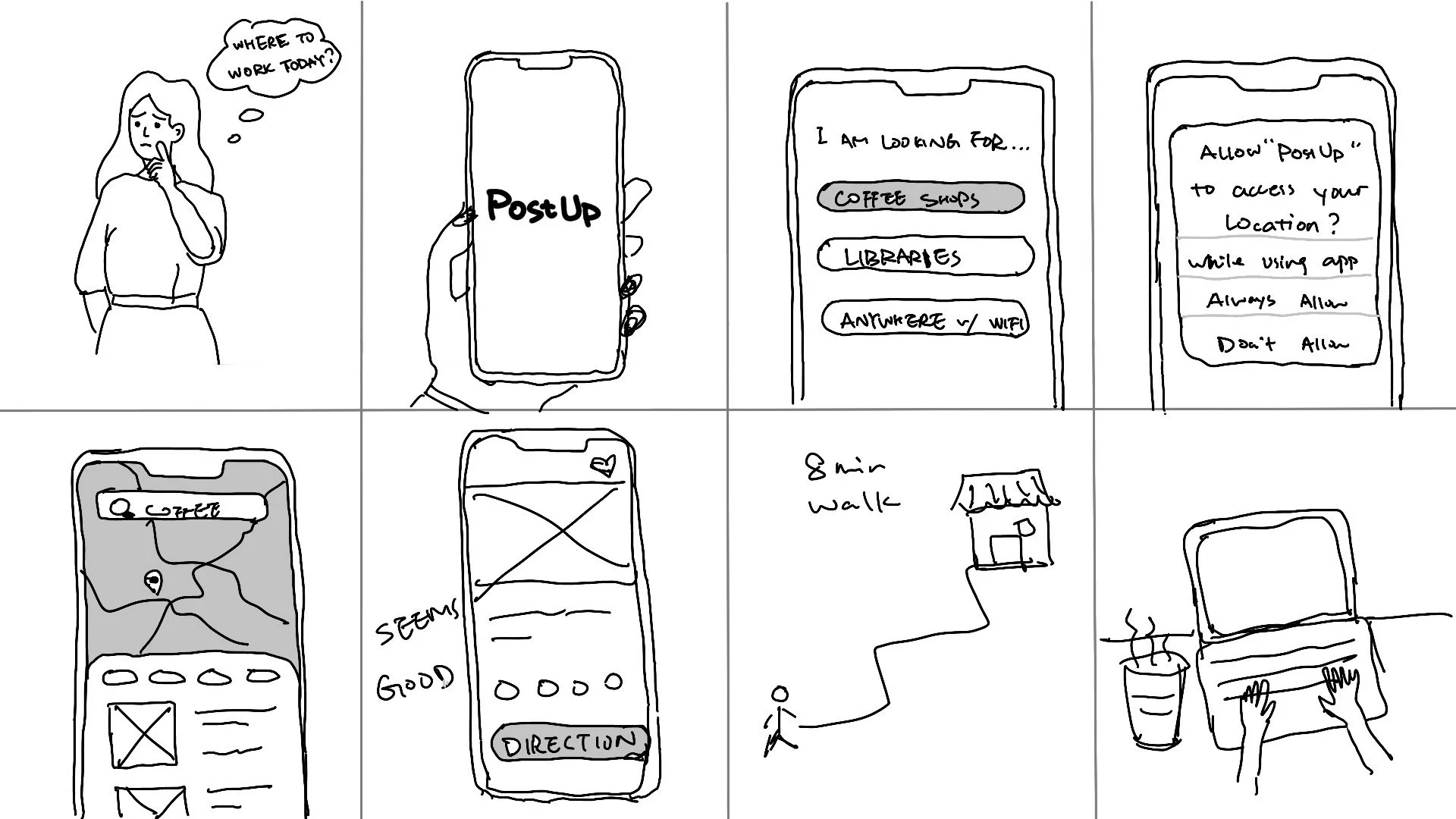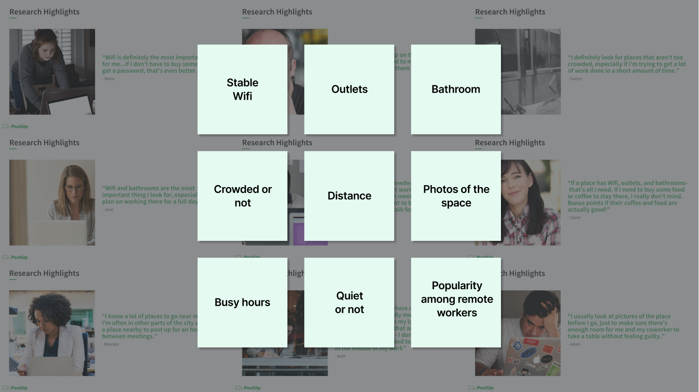 PostUp is a new startup that wants to make it easier for freelancers and remote workers to find great coffee shops and public spaces to work from. They did user interviews to learn user pain points, and research on current method users used to seek for gaps and opportunities.