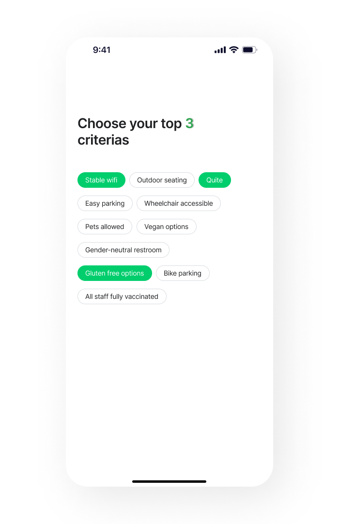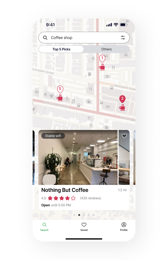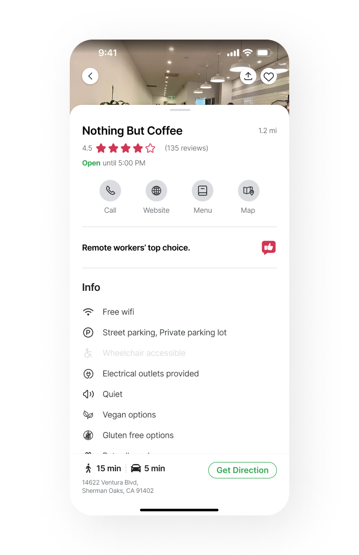 Display useful information to help determine if this place has all the amenities the user needs. Showing “Remote workers’ top choice” will bring the user the sense of immediate connection.