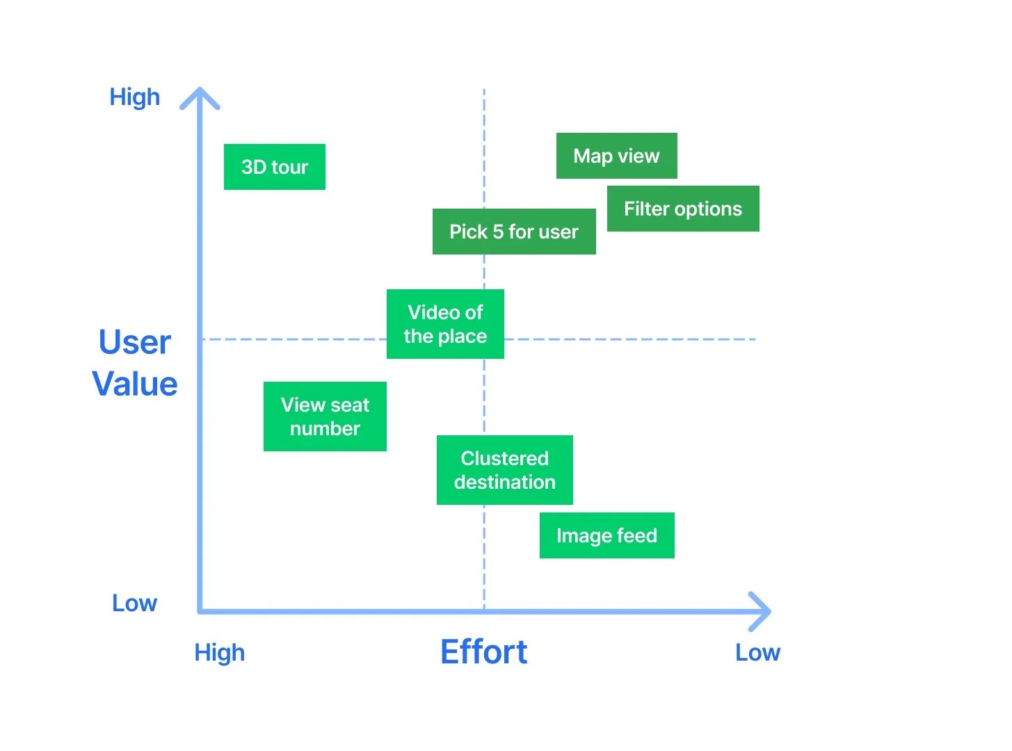 Design prioritization matrix was used to help determine the 3 design aspects to further develop - map view, filter options and pick 5 for user. I then created a storyboard to better understand the scenario from the user’s perspective.